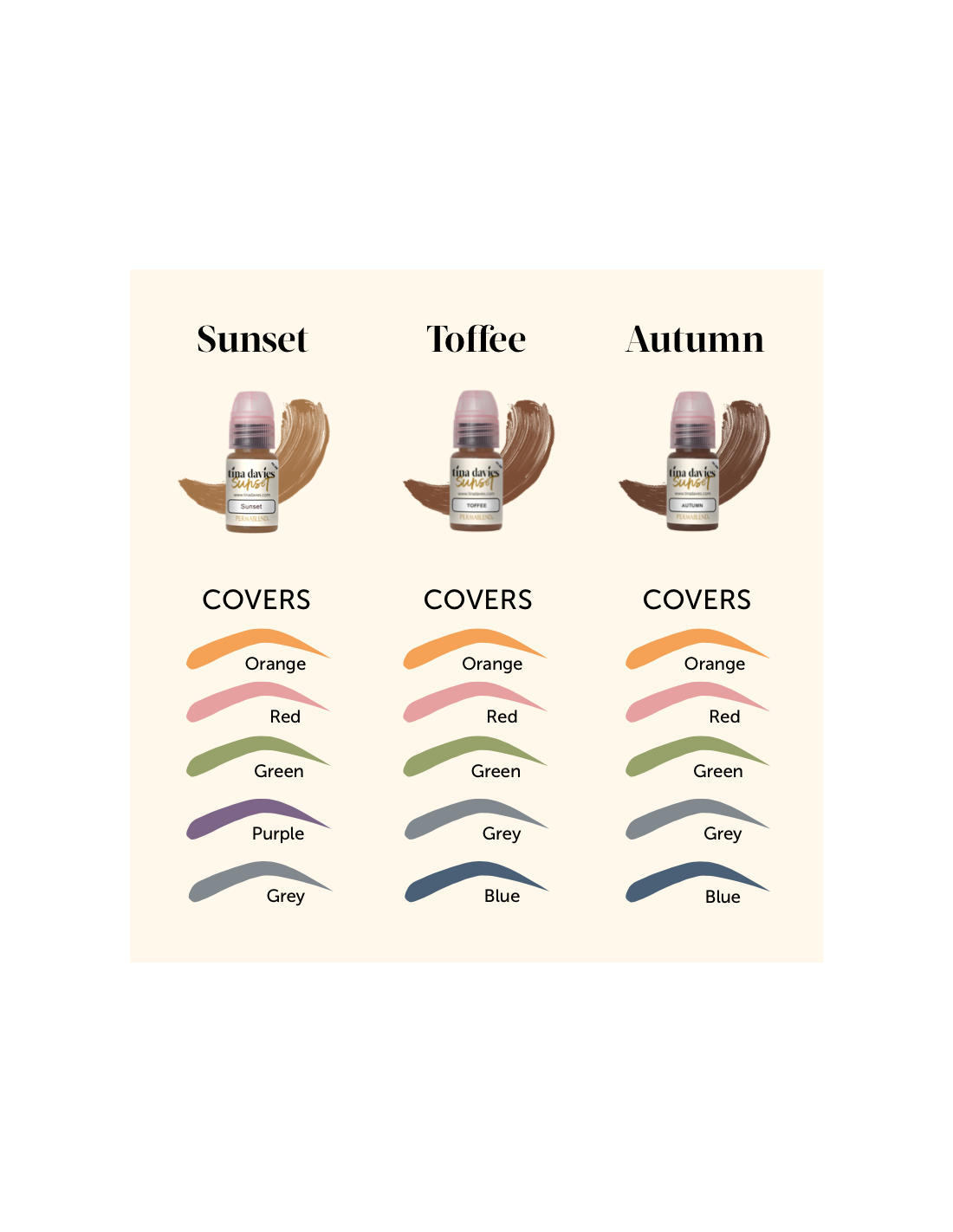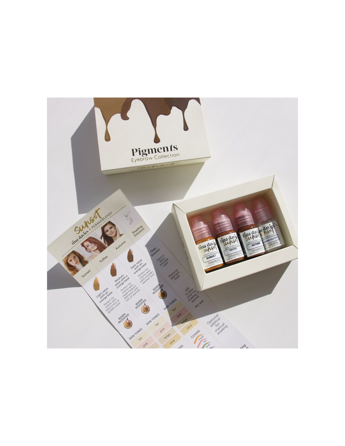 Desde colores de pelo rojo cálido como el jengibre, cobre y caoba hasta rojos fríos y rubíes profundos, la NUEVA Colección de Cejas al Atardecer de Tina es un rayo de sol para los clientes con esta coloración.