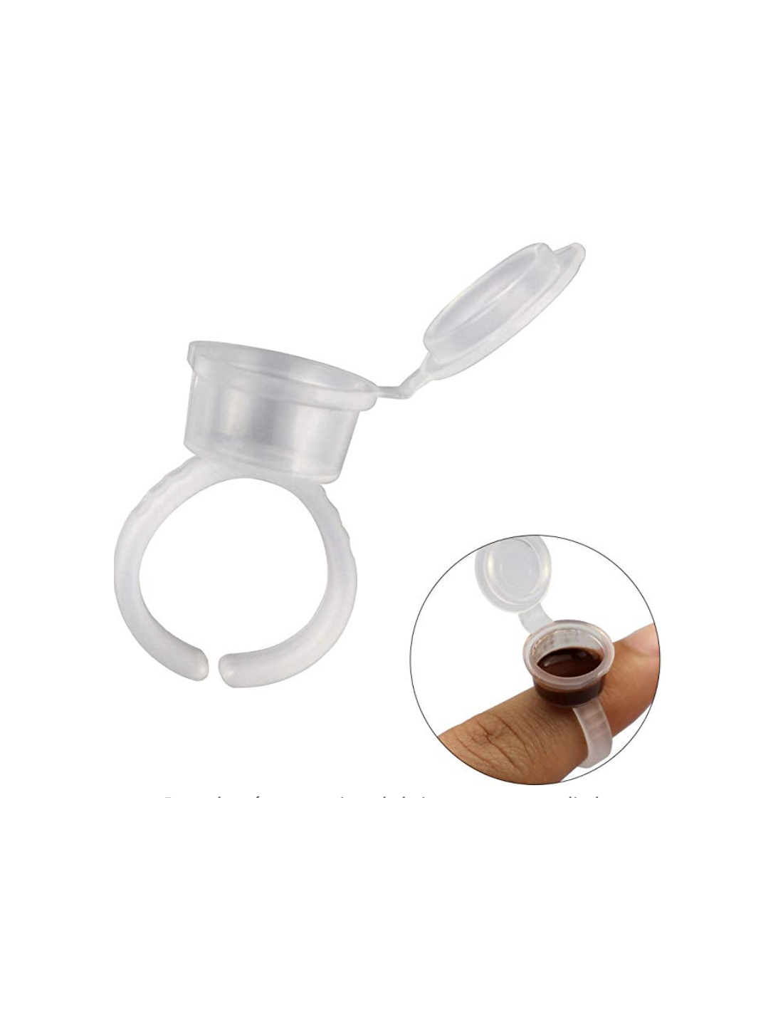 Anillo para pigmento con tapa. Gracias a su color transparente podrás distinguir fácilmente el color del pigmento. Fabricado en material plástico PE, ligero, y totalmente ajustable. Gracias a la tapa el pigmento no se secara. Adecuado para uso doméstico o profesional. Pack de 50 unidades.