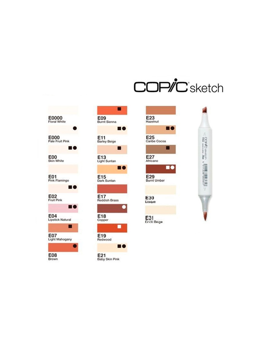 Copic Sketch es el marcador gráfico más vendido, utilizado principalmente por los profesionales creativos en muchos campos del diseño, la ilustración y las bellas artes. Presenta nuestras puntas flexibles Super Brush y Medium Broad, recargables y con un diseño ovalado ergonómico y tapones con código de colores.