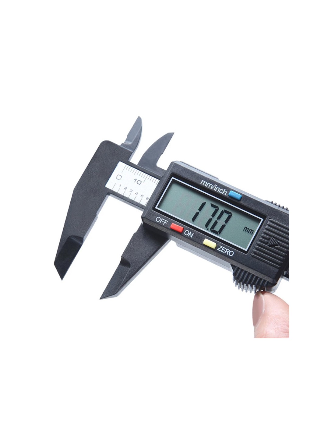 Calibre digital hecho de plástico técnico de protección ambiental endurecido con medidor de profundidad y mordaza rectificada con precisión. Tiene un buen cuerpo de plástico que está bien equilibrado en cuanto al deslizamiento y la fijación a un valor determinado. Rango de medición: 0 - 6 pulgadas / 0 - 150 mm; resolución: 0.005 pulgadas / 0.1 mm; precisión: ± 0.2 mm / 0.01 pulgadas. Tiene pantalla LCD grande y fácil de leer. Tiene dos modos: pulgadas y milímetros. Puedes ponerlo en cero con un fácil toque de botón y comenzar una nueva medición en cualquier punto de la escala. Ideal para mediciones precisas como el diseño de cejas.