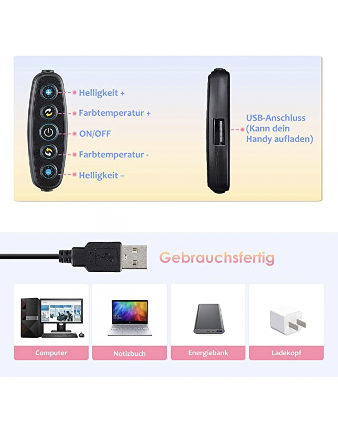Aro de Luz con 5 Temperaturas de Color y 5 Modos de Brillo con un Máximo 1200 lúmenes, Trípode Ajustable 43-110 cm de altura., incluye también trípode de escritorio, y el soporte de teléfono se puede girar 360 ° colocándolo tanto en vertical como en horizontal siendo compatible con la mayoría de teléfonos. Gracias a su puerto usb puedes estar cargando el teléfono mientras haces fotos o grabas la sesión.