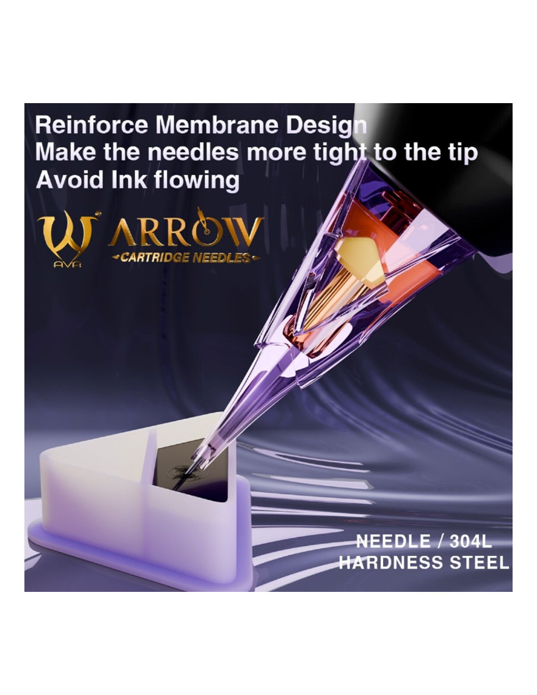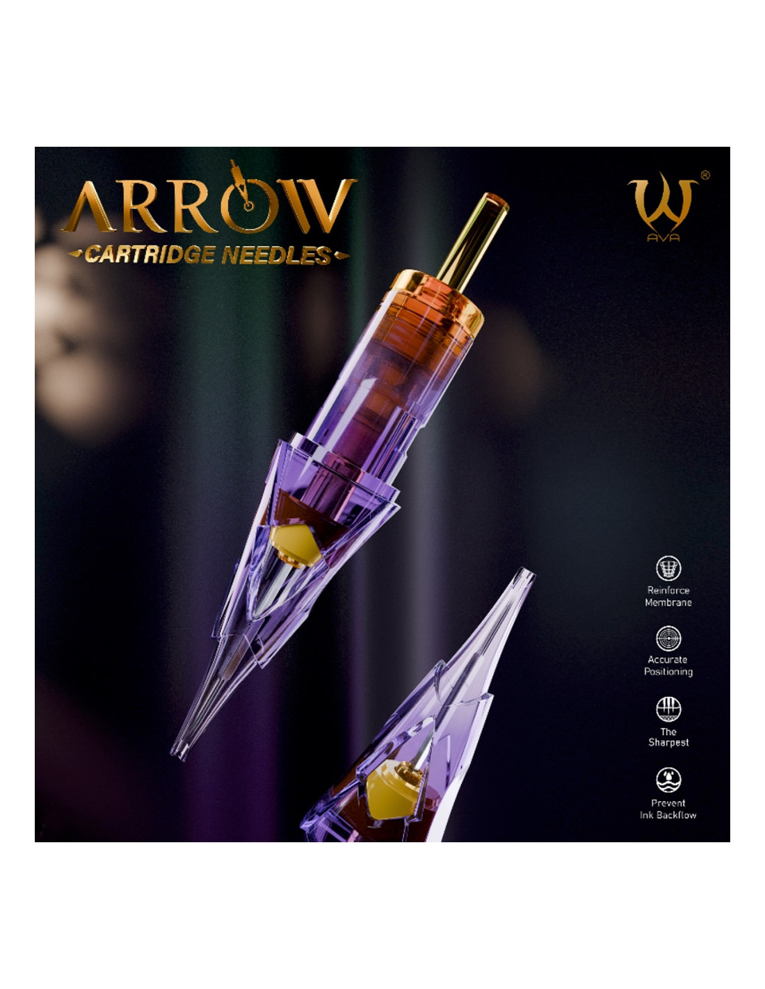 La distintiva punta en forma de V de las agujas púrpura ARROW no solo mejora la absorción de pigmento, sino que también facilita una coloración más rápida y uniforme. Su diseño exclusivo de fascia asegura que el pigmento se mantenga en su lugar, minimizando derrames y potenciando la precisión en cada detalle.