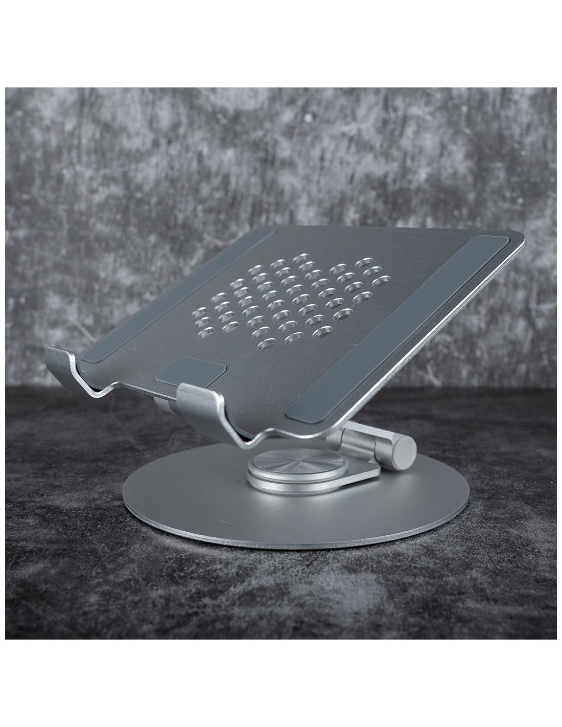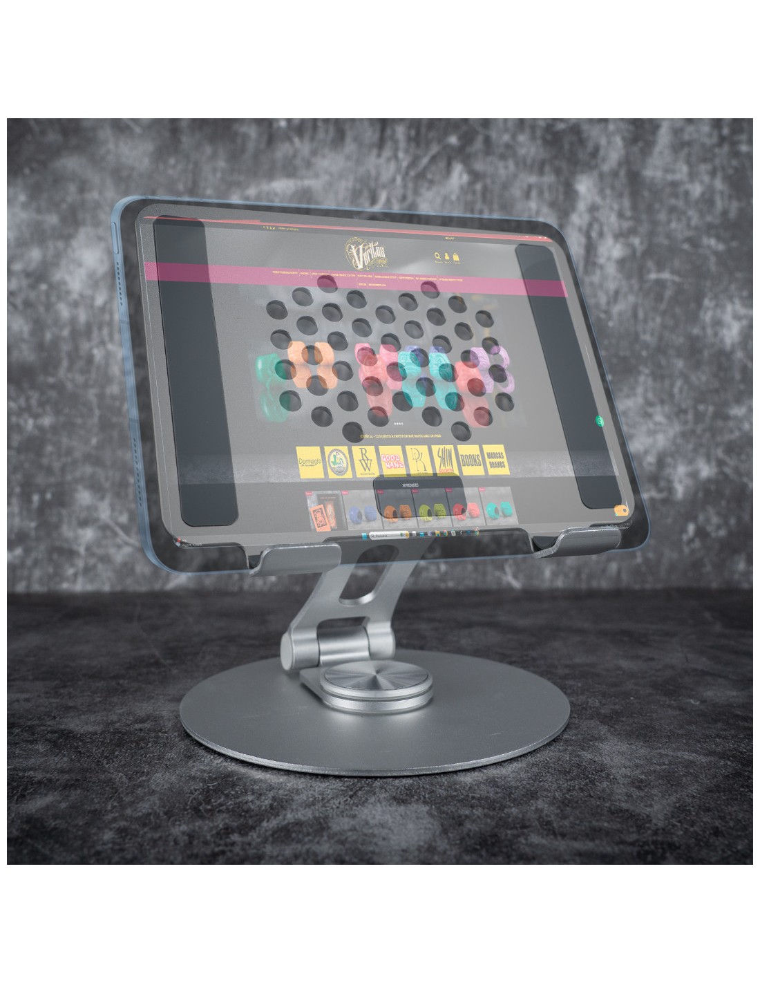 Suporte para tablet totalmente ajustável para fixar em apoios de braços, mesas, carrinhos ou outros móveis semelhantes.