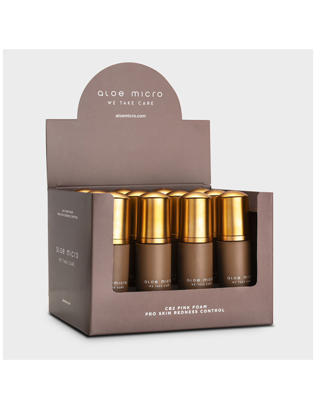 O expositor Aloe Micro Pro Skin Redness Control Foam inclui 12 frascos de 60 ml, perfeitos para estúdios profissionais que pretendam oferecer aos seus clientes um produto suave e eficaz, especialmente formulado para peles sensíveis, irritadas ou danificadas.