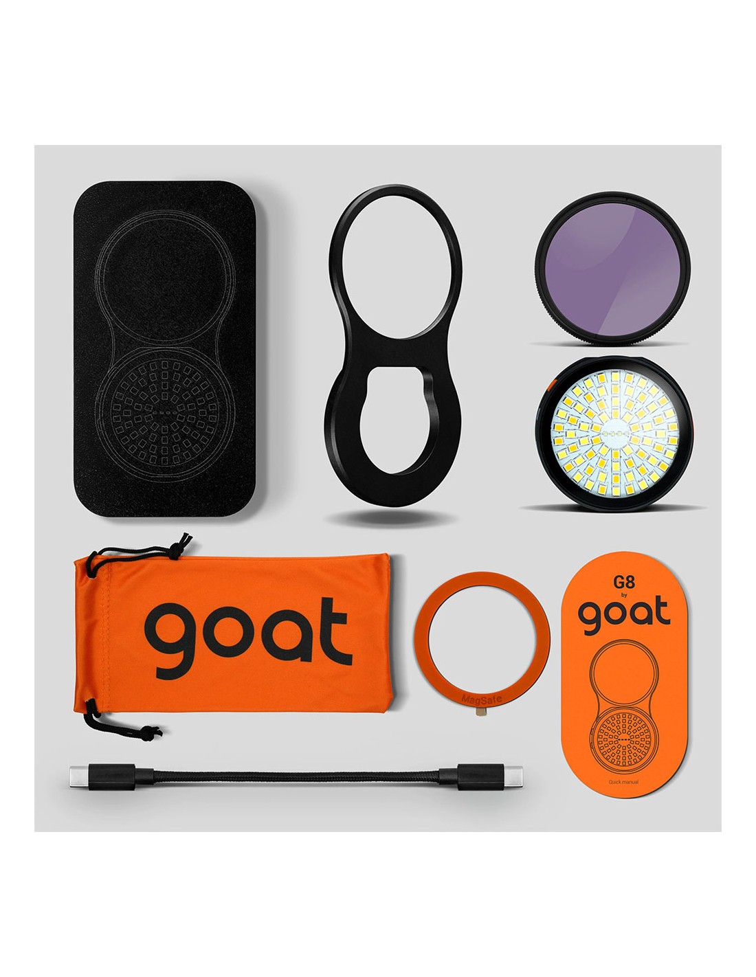 Na caixa encontra: moldura G8, filtro K&F CPL, unidade LED com CPL aplicado, cabo USB-C entrançado, anel Magsafe, saco de microfibras, caixa de plástico, manual.