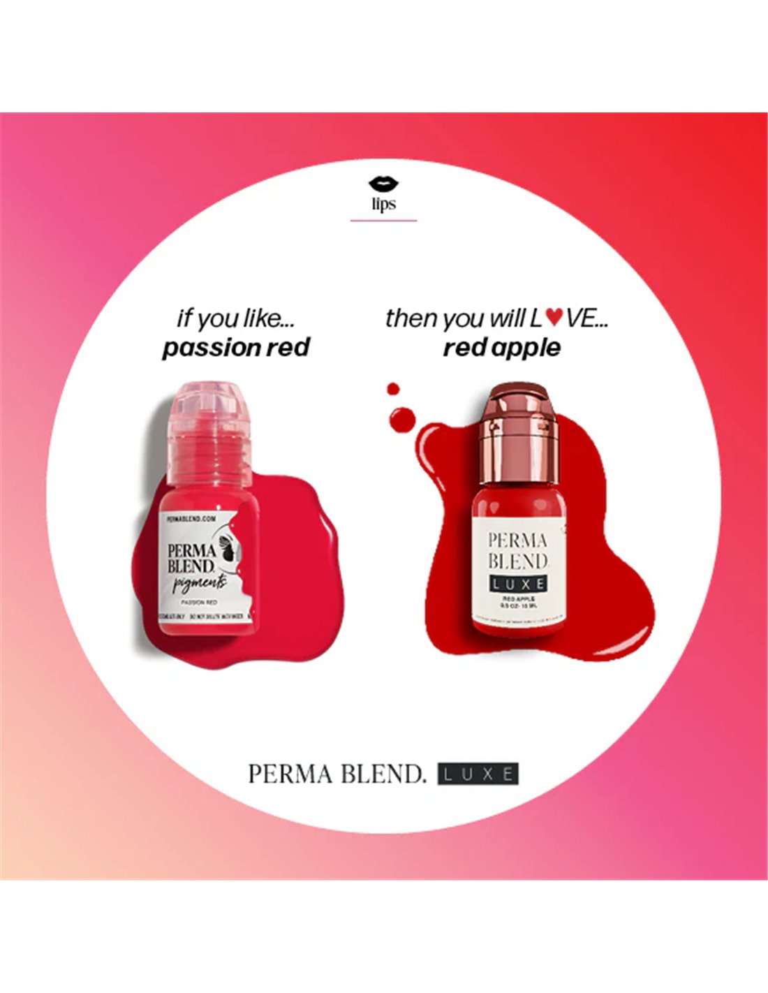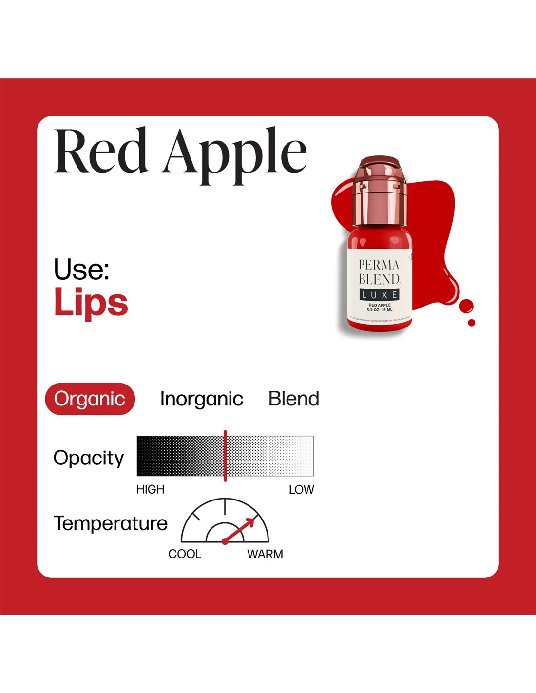 Um impressionante vermelho médio brilhante com um ligeiro tom de vermelho rosado. Tendo em conta as propriedades transparentes do Red Apple, a cor natural dos lábios da cliente contribuirá para a cor final curada.