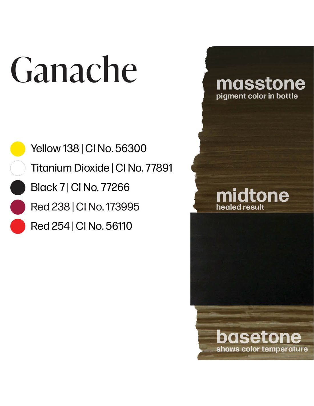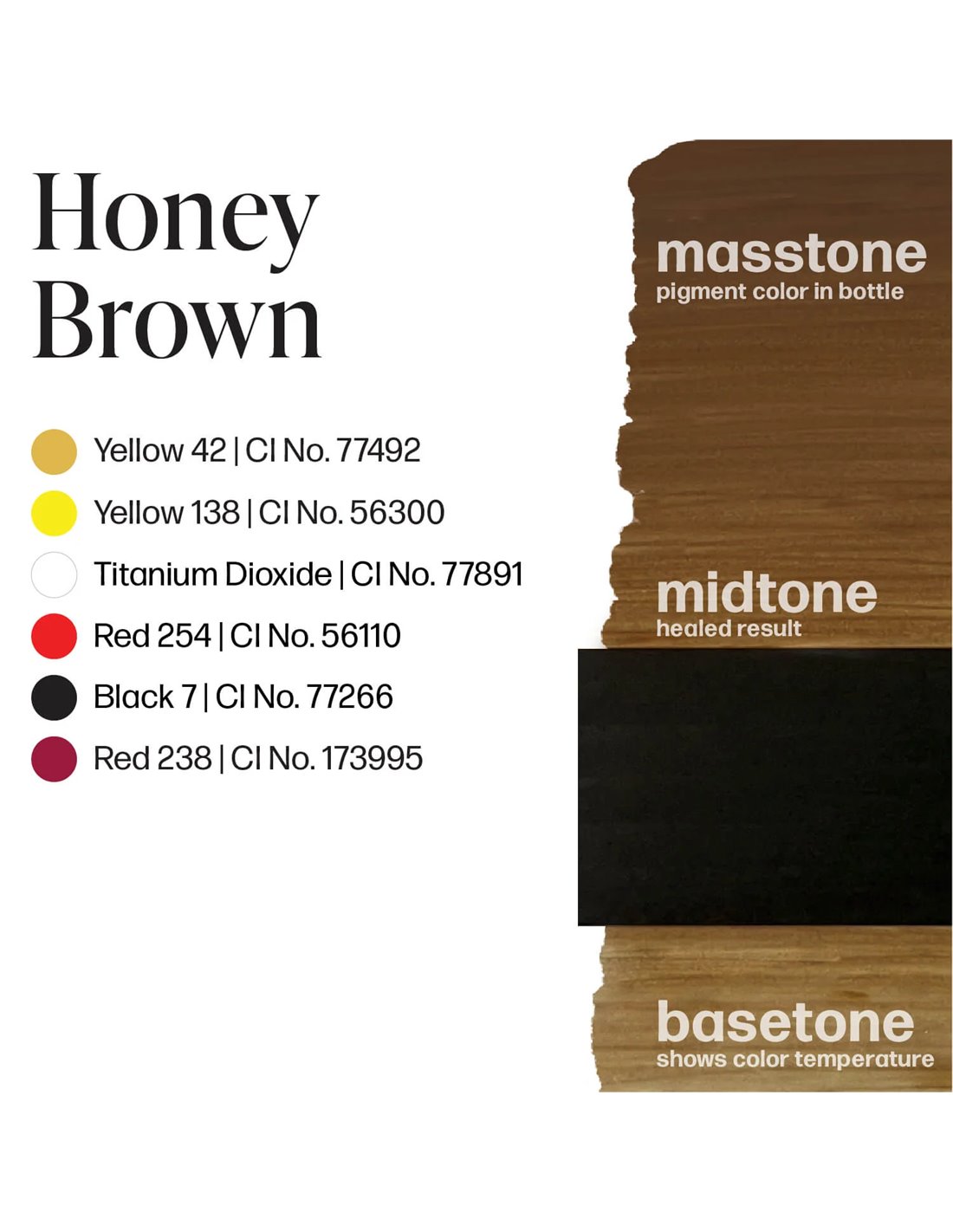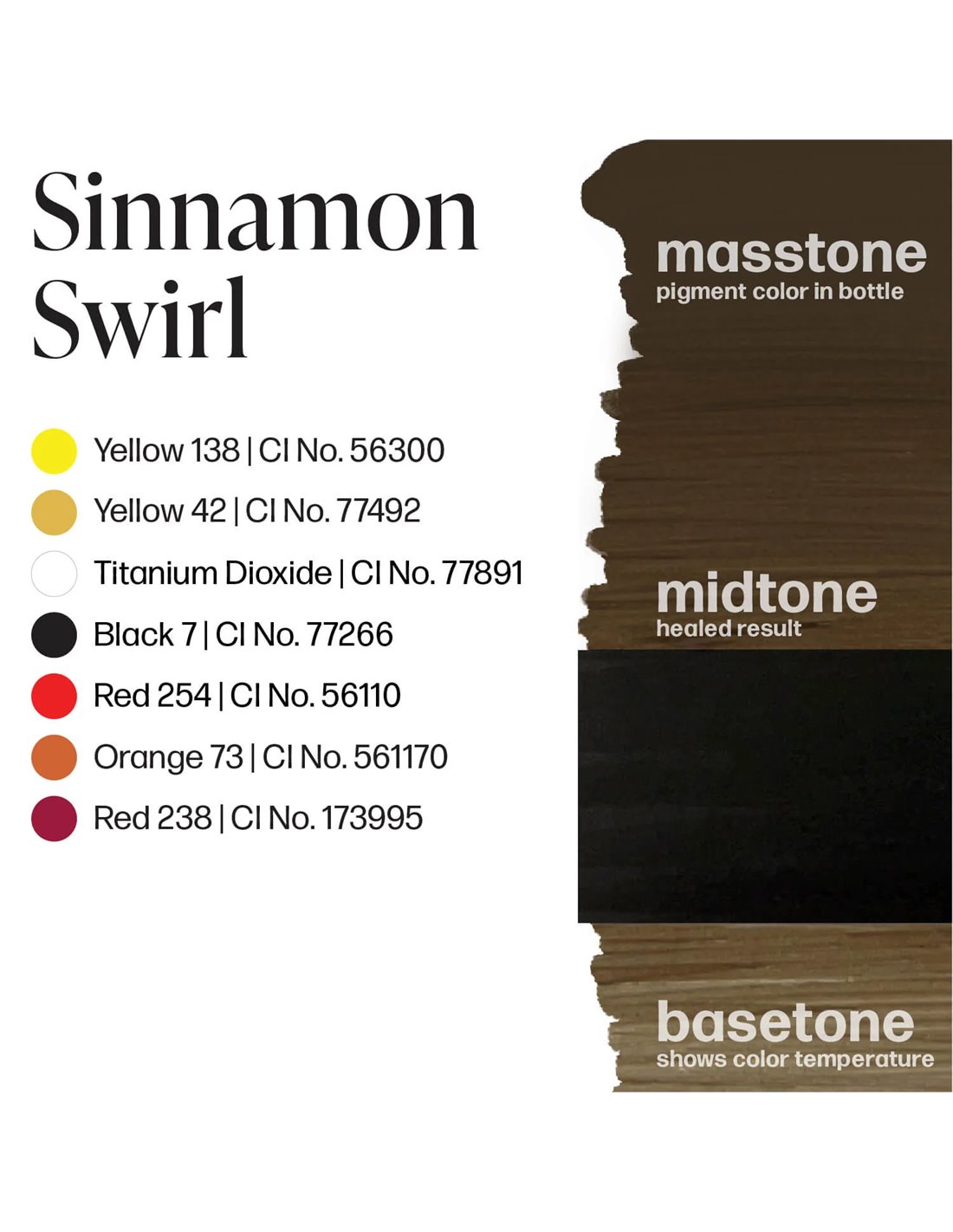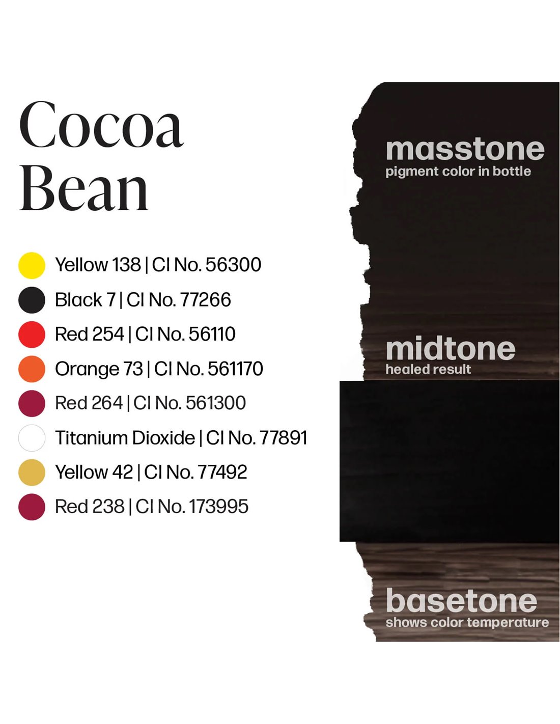 Cocoa Bean - Um tom castanho expresso frio e profundo; Sinnamon Swirl - Um castanho torrado neutro para adicionar a camada perfeita de calor Fondue - Um castanho rico e maravilhosamente derretido que faz lembrar um glacé Maple Sugar - Um castanho escuro leitoso com tons terrosos ricos e quentes Honey Brown - Um castanho dourado esmaltado com tons âmbar quentes que vão desde os amarelos pálidos aos castanhos profundos Ganache - Faz lembrar a textura suave e aveludada da ganache de chocolate que lhe dá nome.