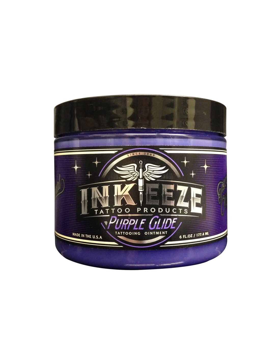 Purple Glide é formulado com óleo de cártamo, óleo de tamandu e óleos de lavanda para acalmar, hidratar e proteger a pele. É para ser usado como lubrificante durante o processo de tatuagem e para os clientes usarem como tratamento posterior.